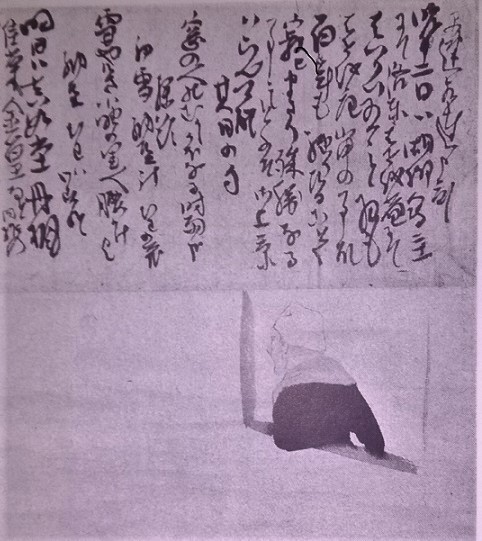 上記の「窓辺の蕪村(像)」の軸物は、上段が蕪村の書簡で、その書簡の下に、月渓(呉春)が「窓辺の宗匠頭巾の人物」を描いて、それを合作の軸物仕立てにしたものである。